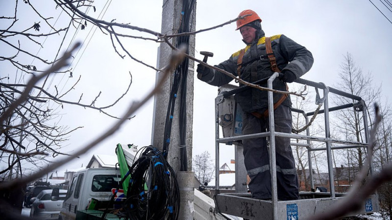 Енергетик компанії ДТЕК ремонтує електромережі у Деснянському районі Києва, Україна, 26 січня 2026 року. Getty Images/Danylo Antoniuk/Ukrinform/NurPhoto