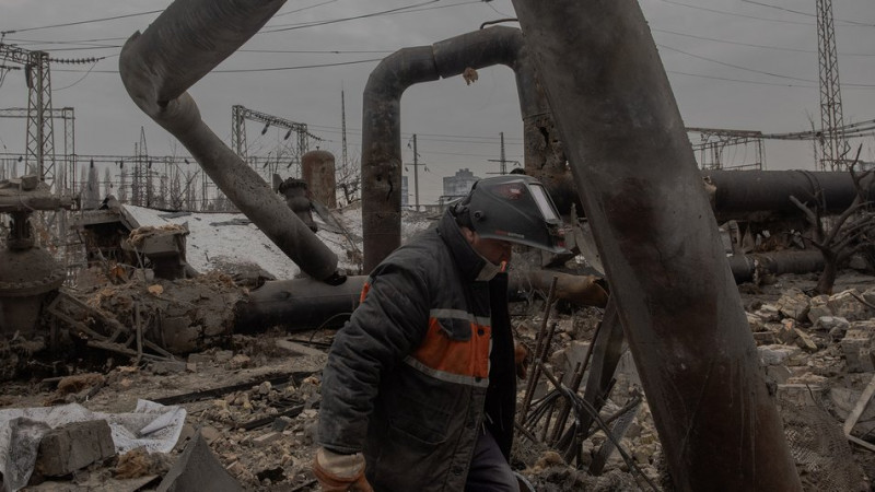 Енергетик ремонтує секції Дарницької ТЕЦ (ТЕЦ-4), пошкодженої внаслідок російських авіаударів, Київ, 4 лютого 2026 року. Масовані російські удари по енергетичній інфраструктурі України призвели до відключення світла, опалення та водопостачання мільйонів людей по всій країні. Getty Images/AFP/Roman Pilipey