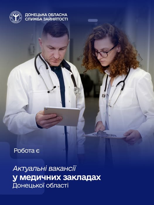 До уваги пошукачів роботи у медичній сфері! Донецький обласний центр зайнятості інформує про актуальні вакансії у медичних закладах області. КНП «МКЛ м. Слов’янська» запрошує на роботу: • лікаря-акушера-гінеколога — 23 000 грн; • лікаря-терапевта — 23 000 грн; • лікаря з медицини невідкладних станів — 23 000 грн; • лікаря-алерголога — 23 000 грн; • лікаря-ортопеда-травматолога — 23 000 грн; • лікаря-хірурга — 23 000 грн; • ерготерапевта — 23 000 грн; • лікаря-невропатолога — 23 000 грн; • лікаря-офтальмолога — 23 000 грн; • лікаря фізичної та реабілітаційної медицини — 23 000 грн. ФОП Моторний Антон Валерійович (м. Слов’янськ) — лікар-стоматолог, 30 000 грн. КНП СМР «ЦПМСД м. Слов’янська» — лікар загальної практики – сімейний лікар, 20 000 грн. КНП «ОДЛ м. Слов’янська» запрошує: • лікаря-алерголога — 25 000 грн; • лікаря-офтальмолога — 25 000 грн; • клінічного психолога — 25 000 грн; • лікаря-анестезіолога — 25 000 грн; • фармацевта — 23 000 грн; • лікаря-педіатра-неонатолога — 23 000 грн. КНП «ЦПМСД» Миколаївської міської ради Краматорського району (м. Миколаївка) — лікар загальної практики – сімейний лікар, 20 000 грн. КНП «МЛ №2» Краматорської міської ради пропонує: • медичну сестру (брата) — 15 000 грн; • молодшу медичну сестру (брата) з догляду за хворими — 9 000 грн; ЦНСП Черкаської селищної ради (смт Черкаське) — психолог, 15 000 грн. ФОП Даниленко Олександр Володимирович (м. Слов’янськ) — масажист, 14 000 грн. КНП «Слов’янська ЦРЛ» — фельдшер-лаборант, 13 500 грн. ФОП Замай Олексій Сергійович (м. Краматорськ) — фармацевт, 10 000 грн. За детальною інформацією звертайтеся до call-центру Донецького обласного центру зайнятості за номером 0-800-219-713 (дзвінки безкоштовні).