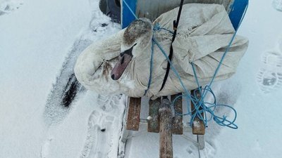 Посеред річки Дніпро на Полтавщині рибалки знайшли замерзлого лебедя. Його годину везли на санчатах, щоб передати для допомоги ветлікарям. Нині він у безпеці й отримує необхідне лікування.