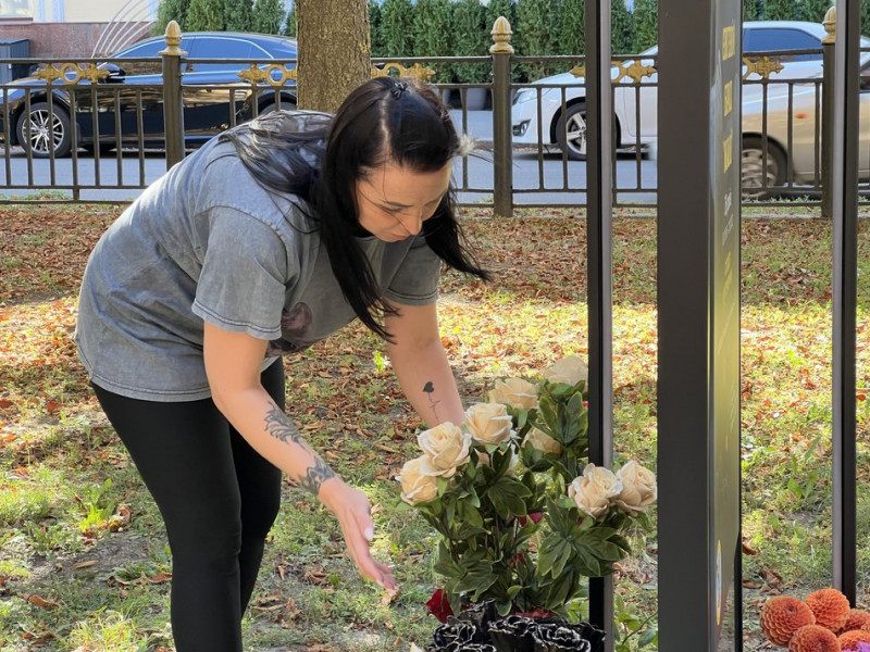 Сестра сестра загиблого Андрія Безпалка біля меморіальної стели на його честь. Суспільне Полтава