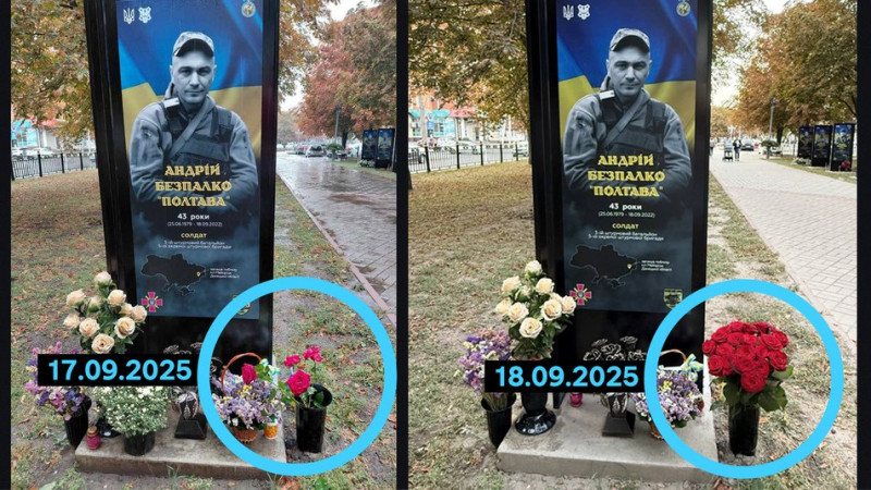 У Полтаві зі щитів Алеї Героїв з портретами загиблих військових невідомі крадуть квіти. Зокрема, це помітила родина Петреченків – зник букет троянд, який вони лишили біля фото бійцеві Андрію Безпалку.