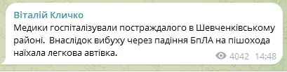 Пізніше очільник КМДА поінформував, що медики госпіталізували постраждалого в Шевченківському районі. Внаслідок вибуху через падіння БпЛА на пішохода наїхала легкова автівка.