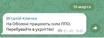 Про це повідомив мер столиці Віталій Кличко. Мешканців міста закликали не ігнорувати повітряну тривогу.