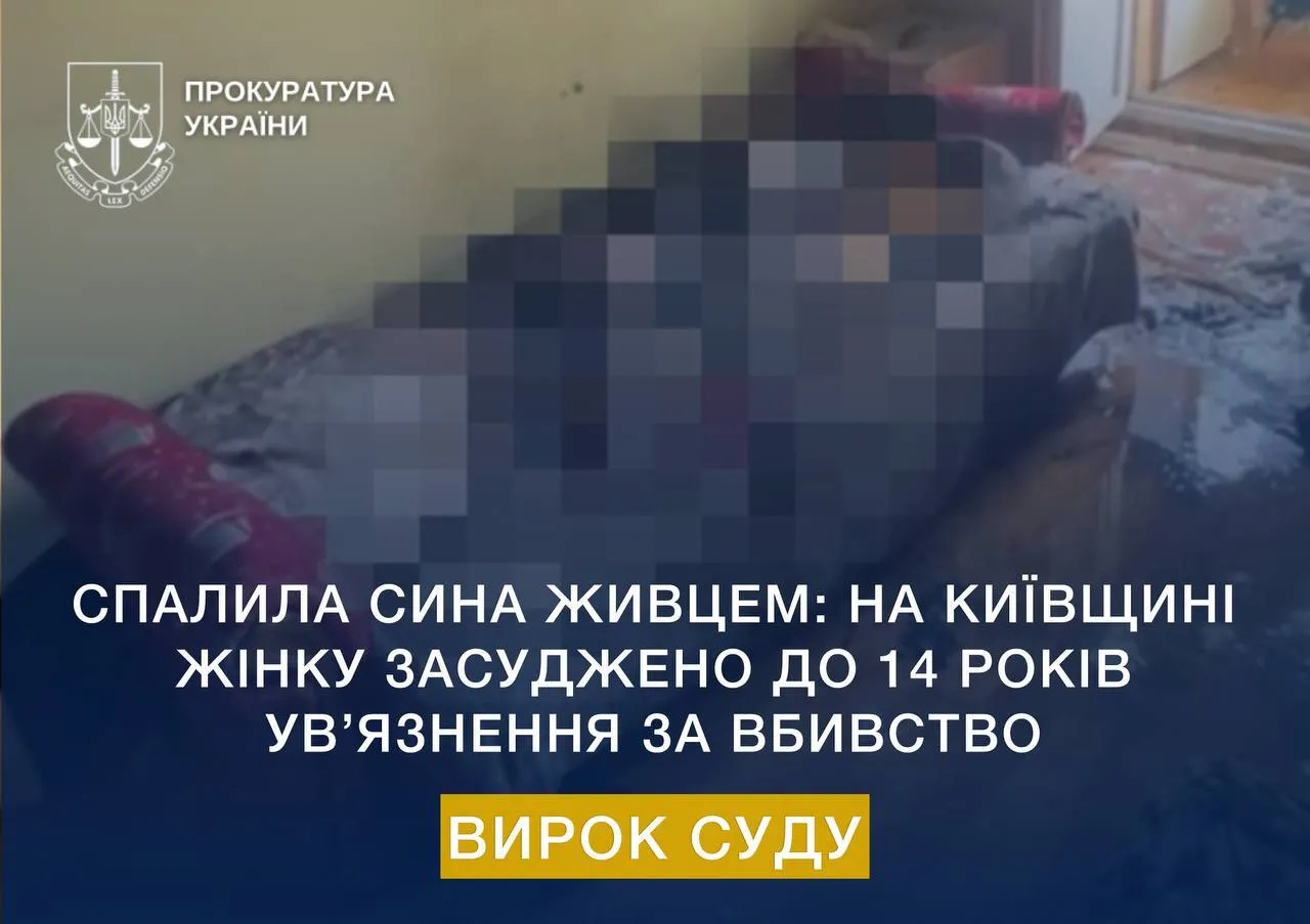 У Білоцерківському районі Київської області суд виніс вирок жінці, яка жорстоко вбила власного сина. Зловмисниця вилила на чоловіка легкозаймисту речовину, після чого підпалила.