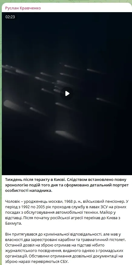 «Тиждень після теракту в Києві. Слідством встановлено повну хронологію подій того дня та сформовано детальний портрет особистості нападника. Чоловік – уродженець Москви, 1968 р. н., військовий пенсіонер. У період з 1992 по 2005 рік проходив службу в лавах ЗСУ на різних посадах з обслуговування автомобільної техніки. Майор у відставці. Після початку російської агресії переїхав до Києва з Бахмута», – написав Кравченко.