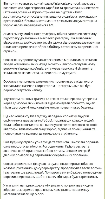 «Біля будинку стрілок убив сусіда та таксиста. Також він поранив сина першого загиблого, його дружину, її рідну сестру та двірника, який прикривав собою дитину. Згодом сестра й двірник померли від отриманих смертельних поранень», – додав Кравченко.