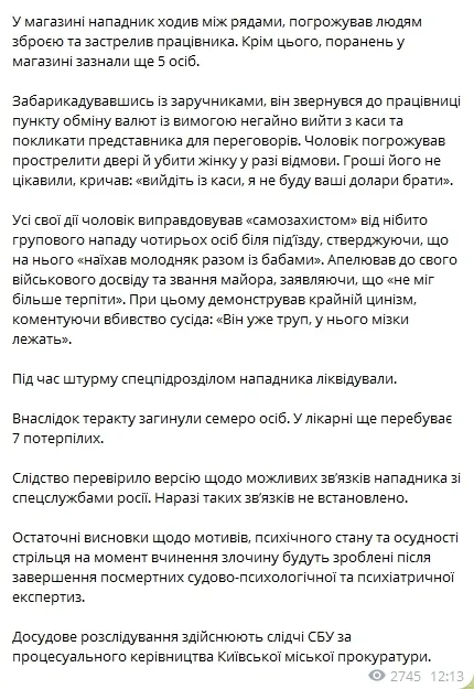 «Слідство перевірило версію щодо можливих зв’язків нападника зі спецслужбами Росії. Наразі таких зв’язків не встановлено. Остаточні висновки щодо мотивів, психічного стану та осудності стрільця на момент вчинення злочину будуть зроблені після завершення посмертних судово-психологічної та психіатричної експертиз», – резюмував Кравченко.