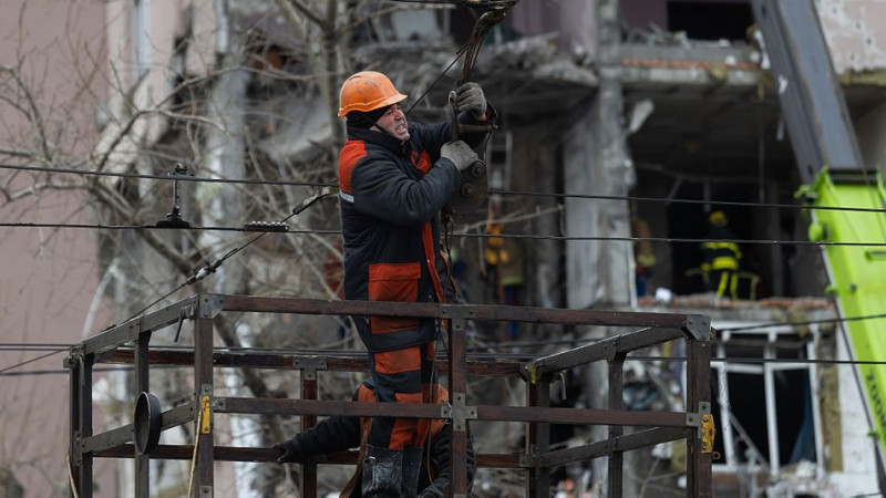 Енергетик ремонтує лінію електропередач у Дніпровському районі столиці, пошкоджену внаслідок удару російського безпілотника, Київ, Україна, 27 грудня 2025 року. Getty Images/Yevhenii Zavhorodnii/Global Images Ukraine