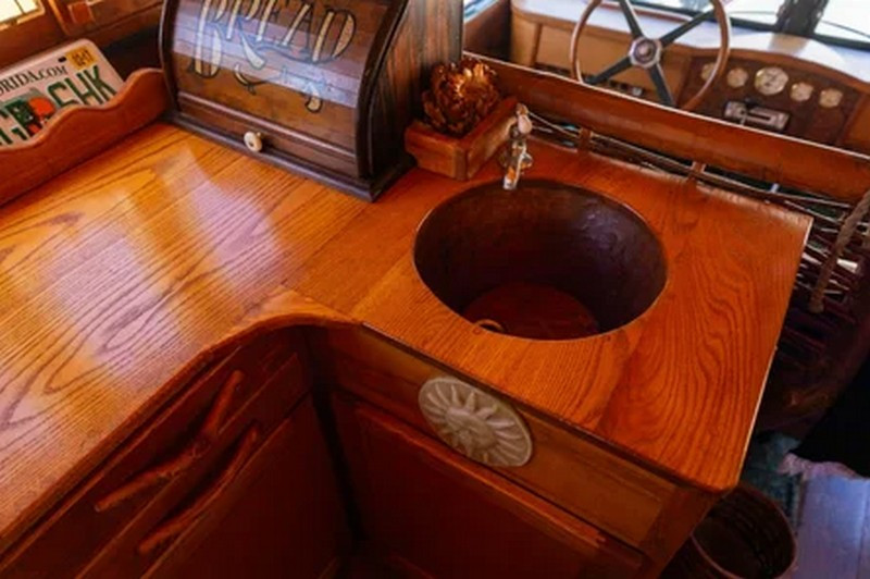Примітно, що навіть раковина виготовлена з дерева. Водійське місце відділене від жилого модуля оригінальним плетеним «тином».