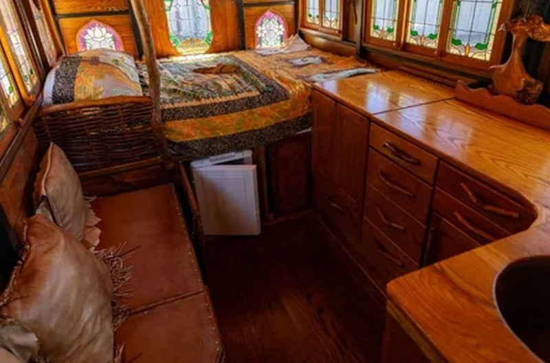 Дім на колесах збудований на шасі вантажівки Chevrolet 1928 року. Його житловий модуль повністю виконаний із дуба та має 21 вікно з вітражами.