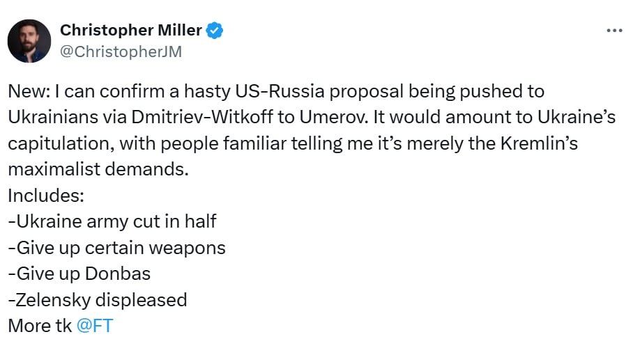 В свою очередь, журналист Financial Times Кристофер Миллер пишет в соцсети X, что план разработанный спецпредставителем президента США Стивом Уиткоффом и переговорщиком от Кремля Кириллом Дмитриевым предусматривает «отказ Украины от Донбасса, сокращение украинской армии вдове и отказ от определенного оружия».
