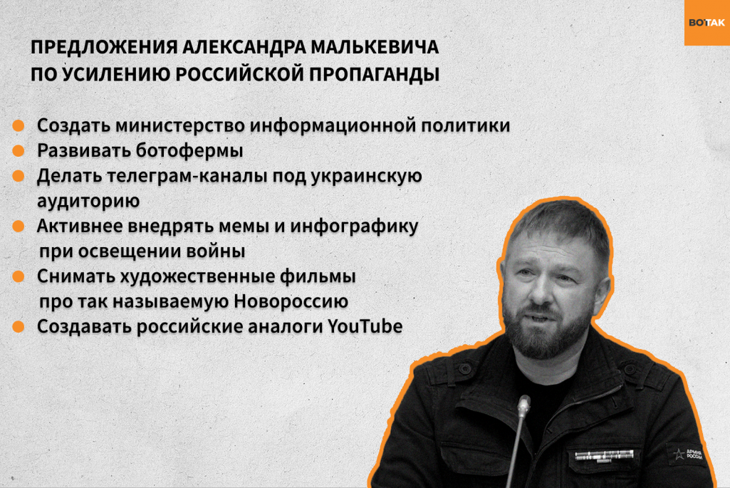 Для цього пропагандист пропонує створити міністерство інформаційної політики, розвивати ботоферми, робити телеграм-канали під українську аудиторію і знімати фільми про «Новоросію».