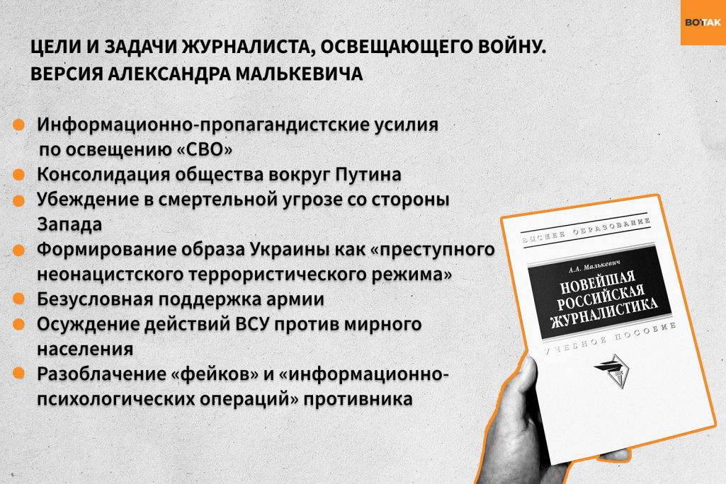 Найвідвертіша частина підручника — глава про «найкращі журналістські практики під час СВО». Малькевич прямо називає висвітлення війни пропагандою.