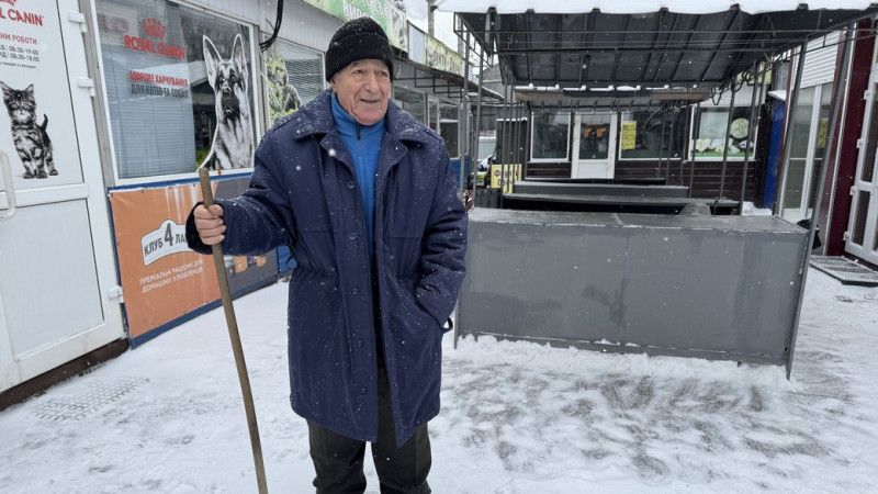 Полтавець Микола Лобанов розмітає сніг біля свого робочого місця на одному з місцевих ринків. Суспільне Полтава