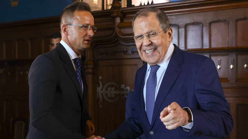 Російський та угорський міністри закордонних справ Сергій Лавров (праворуч) і Петер Сійярто під час зустрічі у Москві, Росія, 21 липня 2022 року. AP/Russian Foreign Ministry Press Service