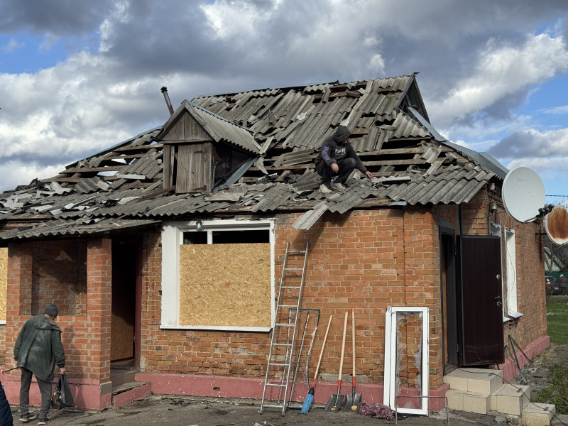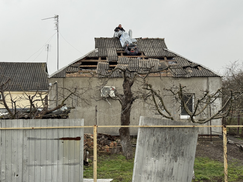 У мікрорайоні приватної забудови після обстрілу працювали комунальники та волонтери. Людям надавали матеріали для швидкого ремонту: плівку, брезенти, OSB-плити тощо.