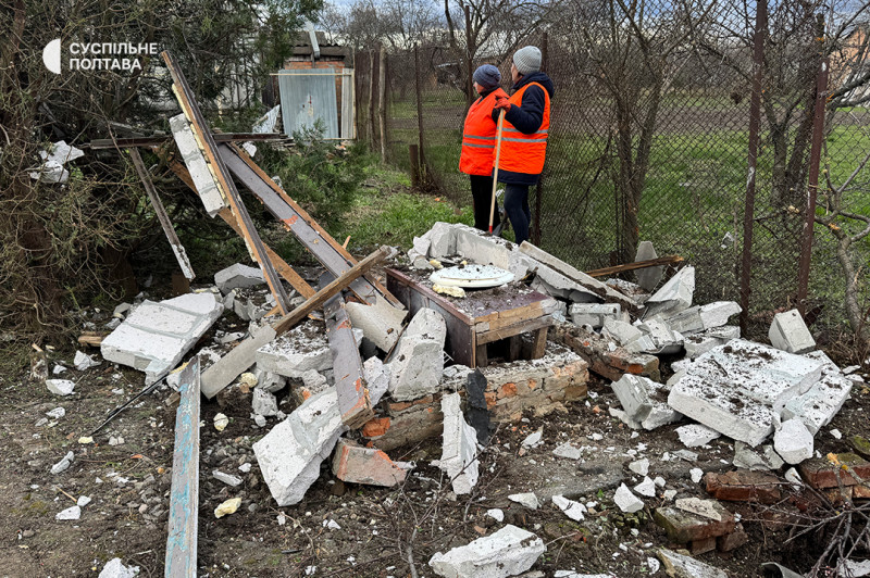 Комунальники на місці обстрілу 7 квітня у Полтаві. Суспільне Полтава