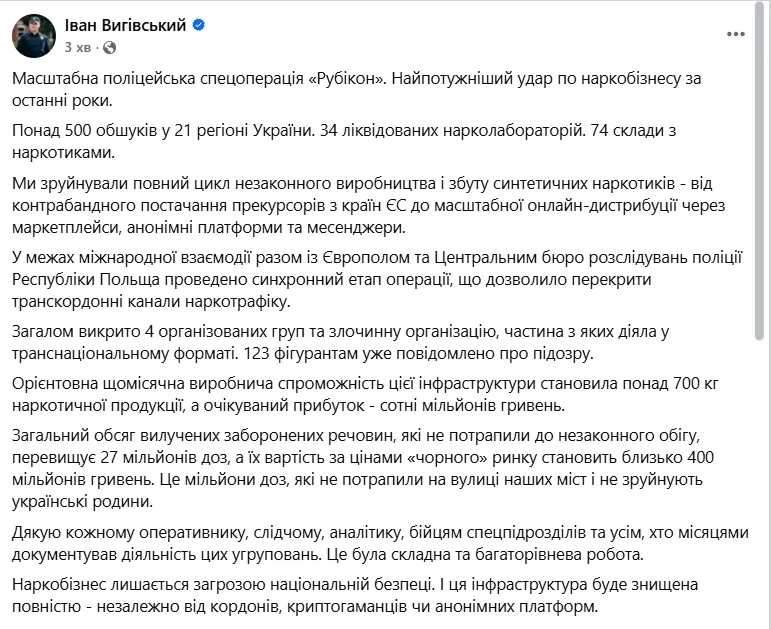 «Масштабна поліцейська спецоперація «Рубікон». Найпотужніший удар по наркобізнесу за останні роки. Понад 500 обшуків у 21 регіоні України. 34 ліквідованих нарколабораторій. 74 склади з наркотиками«, – розповів Вигівський.
