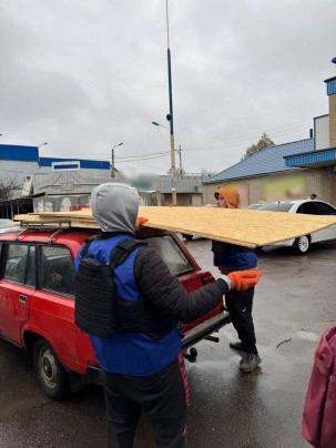 До комплектів увійшли листи OSB, дошки, рейки та брезент — усе необхідне, щоб якомога швидше залатати пошкодження та підготувати житло до зими.