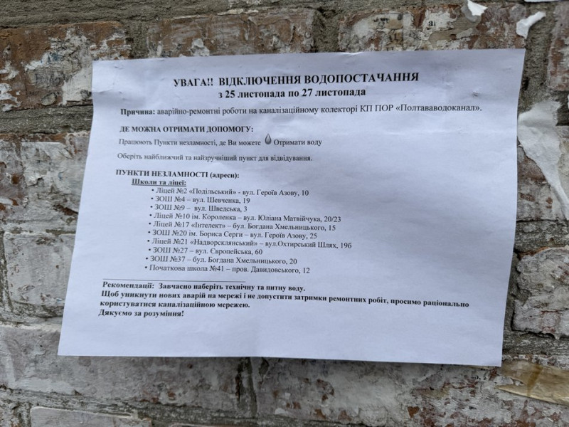 Водопостачання відсутнє у чотирьох мікрорайонах Полтави: Левада, Поділ, Центр та Климівка. Тож у місті запрацювали 10 пунктів незламності, де можна отримати технічну та питну воду.
