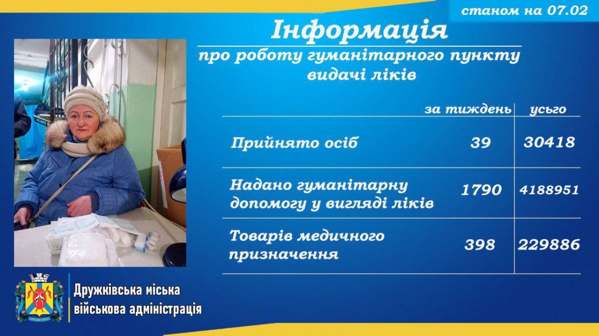Дружківська міська військова адміністрація повідомляє про роботу гуманітарного пункту видачі ліків.