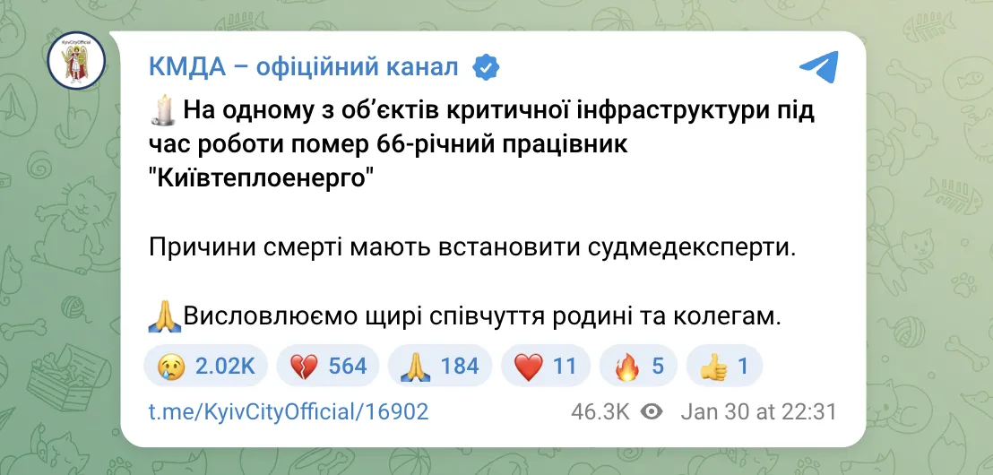 Причини смерті мають встановити судмедексперти. Про це 30 січня повідомили в офіційному Telegram-каналі Київської міської державної адміністрації (КМДА).