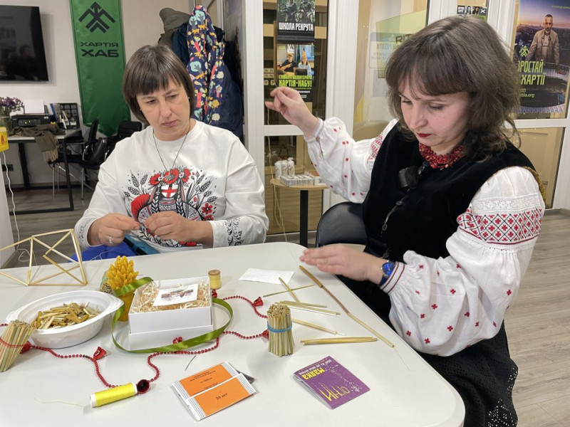 "Ідея виготовлення павуків у мене виникла ще влітку. Я збирала стебла пшениці, вівса, жита, льону для виготовлення дідухів, але коли помолотили поля, я побачила класну таку солому, добротну, виникла ідея зібрати ще солому і виготовити павуки. З метою збору коштів на допомогу Збройним Силам України, бо я волонтерка й різними способами залучаю кошти. Майстер-клас проводимо з метою збору коштів на наземний роботизований комплекс для одного з підрозділів «Хартії». Збір оголосила дружина одного з бійців «Хартії» Вікторія. 300 тисяч сума збору", — розповіла волонтерка Людмила Теймуразян.
