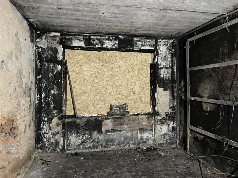 Безпілотник влучив в оселю Олесі Скиби на третьому поверсі. Квартира майже вся вигоріла. Звідси вже вивезли все сміття, а діру у дахові закрили.