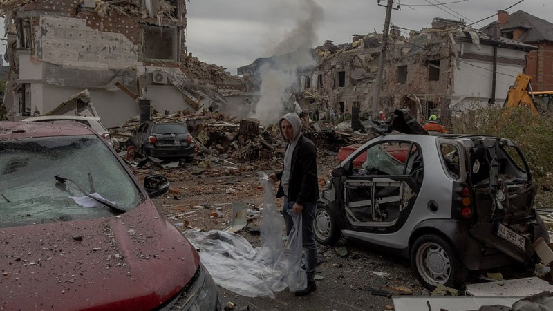 Чоловік після авіаудару на Київщині. Getty Images/ROMAN PILIPEY